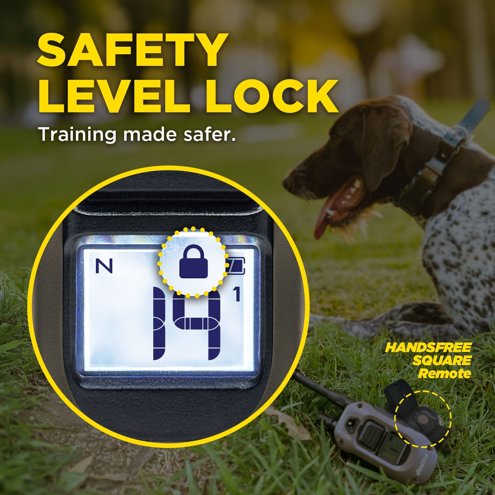 Meet 1900X Handsfree Remote Training System. Versatile Performance packed with a Handsfree Square lets you train without touching the remote. Pair up to 14 squares to any function - tone, light, stimulation, and  each  paired dog. Built for large dogs 35+ pounds with protective casing. 3/4-mile range, XPP vibration, LED visibility. IPX9K waterproof. Training, reimagined.