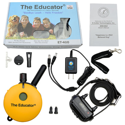 The ET-400 Educator employs proprietary "blunt" stimulation making it the most humane and effective e-collar trainer available. This model is the same as the ET-300 in all aspects except it has a 3/4 of a mile range instead of 1/2 mile. Assembled in the USA, E-Collar technologies systems are completely modular. A one dog system can be configured for second dog or plus system with an additional receiver.